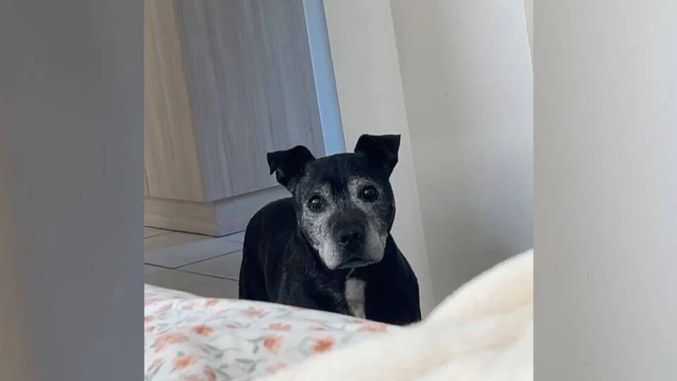 She turned around, expecting to see one of her roommates — but instead, a gray-faced pit bull stood quietly in the doorway, staring up at her like he’d been invited.