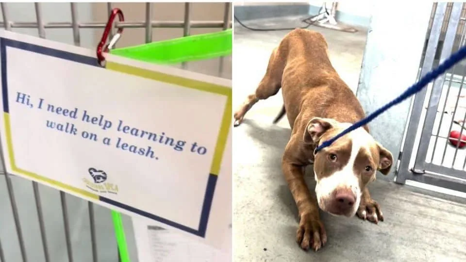 They placed a cheerful note on her kennel door that read, “Hi, I need help learning to walk on a leash.” It was their gentle way of reminding everyone to go slow and patient with her.