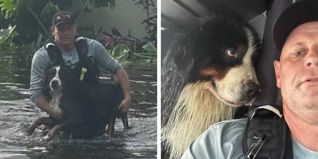 One dog’s thankful gaze became a symbol of every quiet rescue happening in flooded streets that most people would never see.