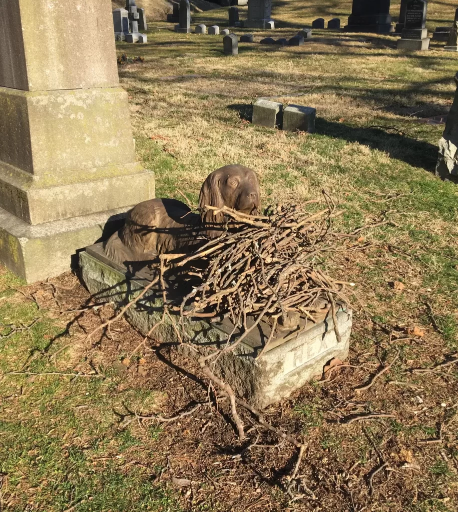 Cemetery staff say it’s impossible to miss him. His statue sits where two quiet roads meet, a peaceful crossroads lined with branches perfect for tossing at his feet.