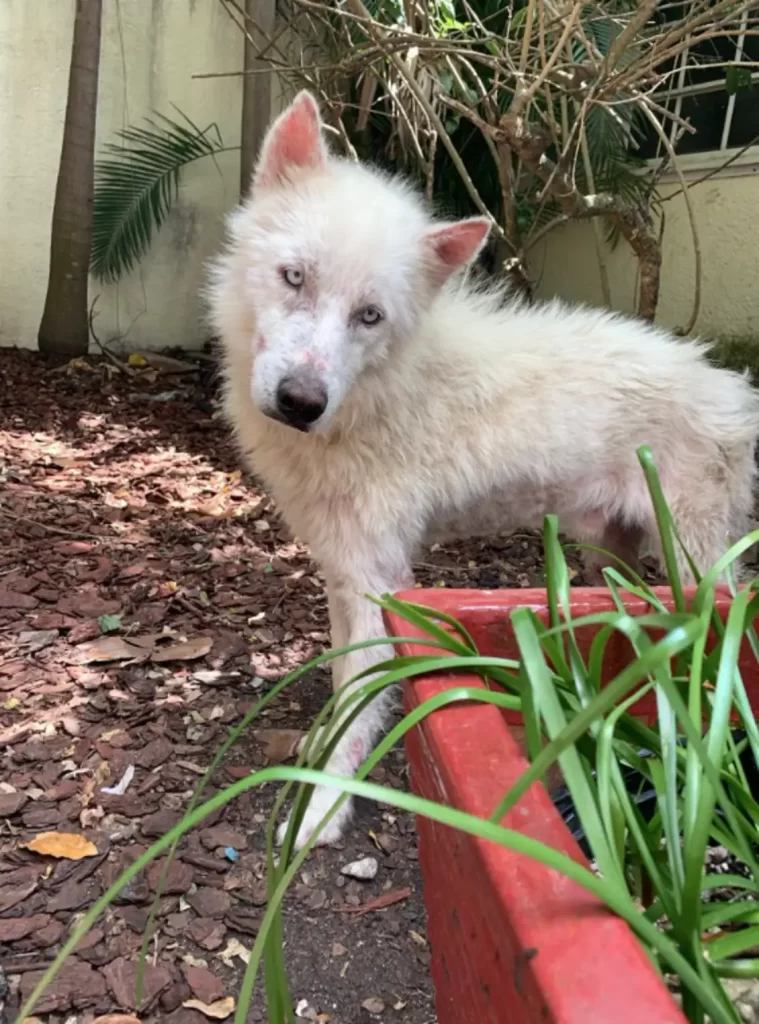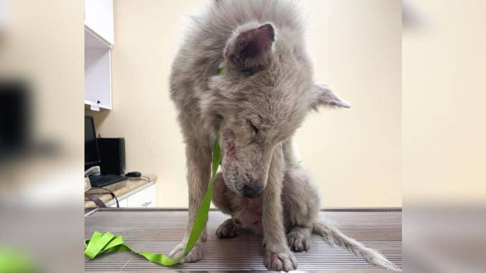 His body told the story of years spent fighting to survive — open sores, missing patches of fur, and ribs that pressed against his skin. Even so, his eyes still carried a quiet spark of life.
