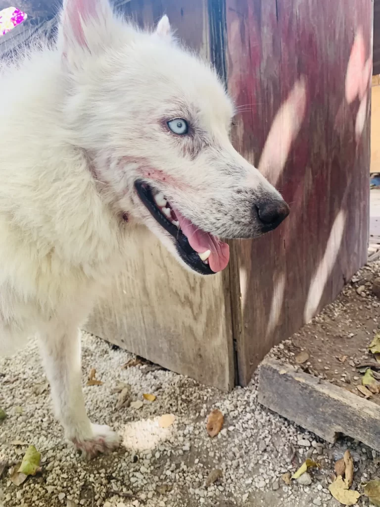 For years, a lone Siberian husky wandered the outskirts of a Bahamian high school, searching for shade beneath parked cars and scraps of food left behind.