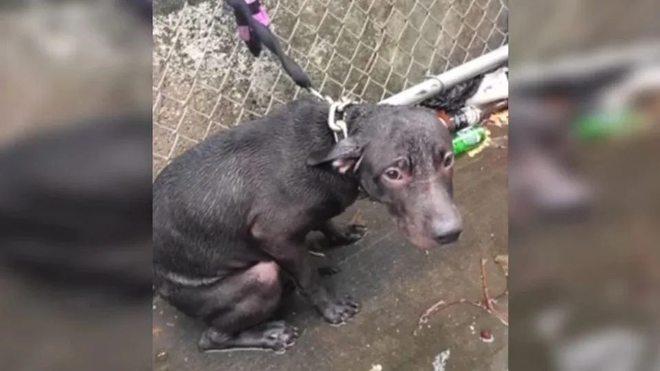 A tiny dog sat alone in a public park, chained to a metal post, with nowhere to run and nowhere to hide.