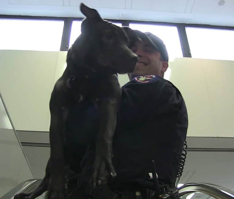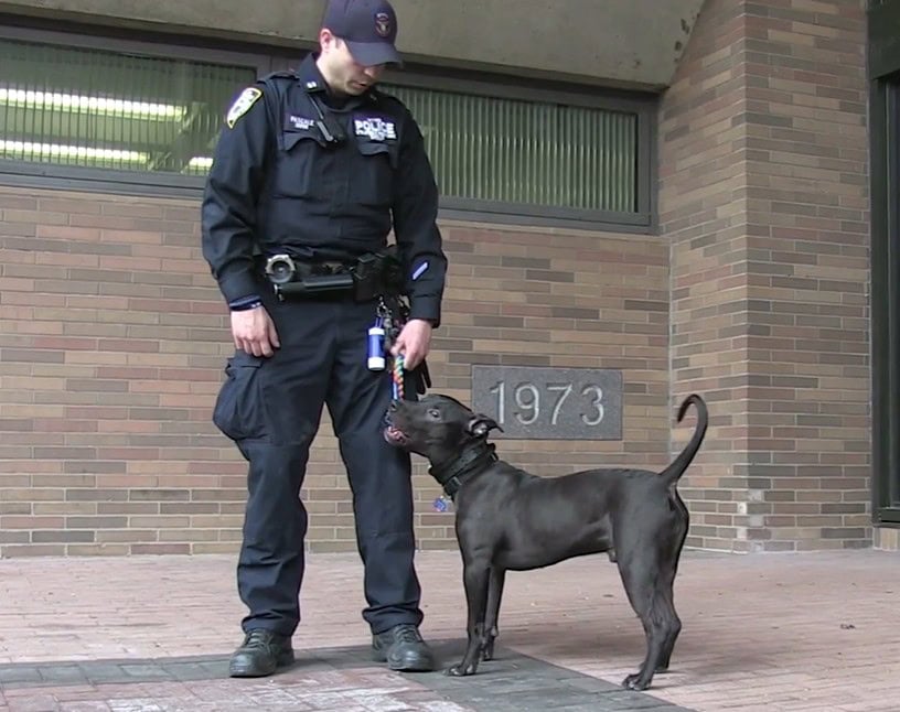 The puppy leaned forward, pressing his wet nose against the officer’s hand.