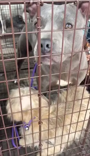 Hall had no choice but to place the pit bull in a roomy crate for the drive, but the smaller dog refused to stay apart. She pushed her body through the car, pawing at the crate until Hall finally let them curl up inside together.