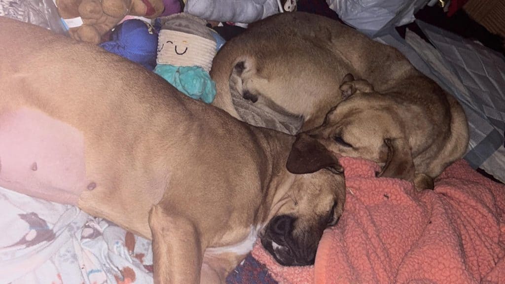 While the rescue team worked behind the scenes, Layla and Lola slept curled up together on their thin blanket, unaware that their entire fate was shifting.