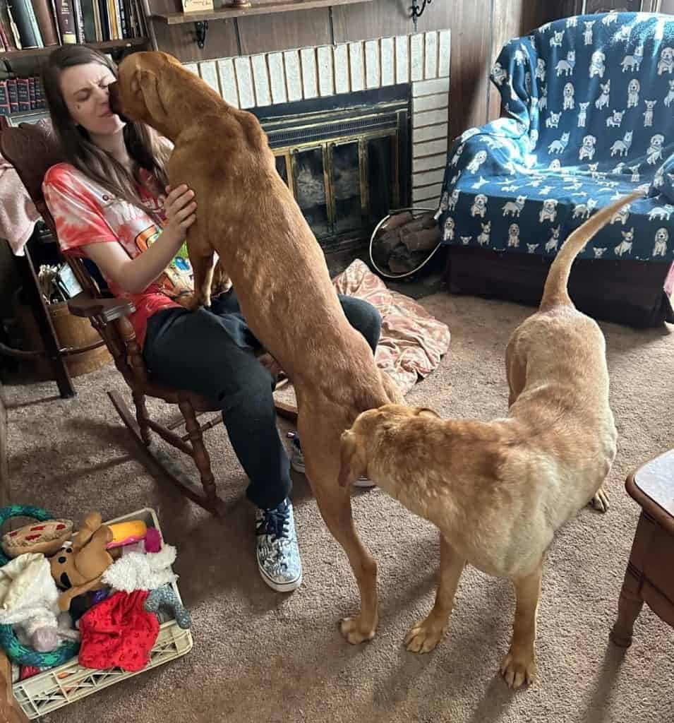 The couple sat gently on the floor, letting the girls approach on their own terms. Layla moved first, resting her head on the woman’s knee.