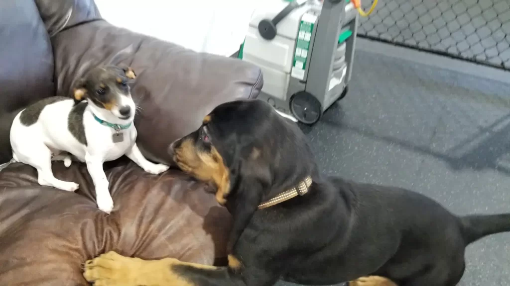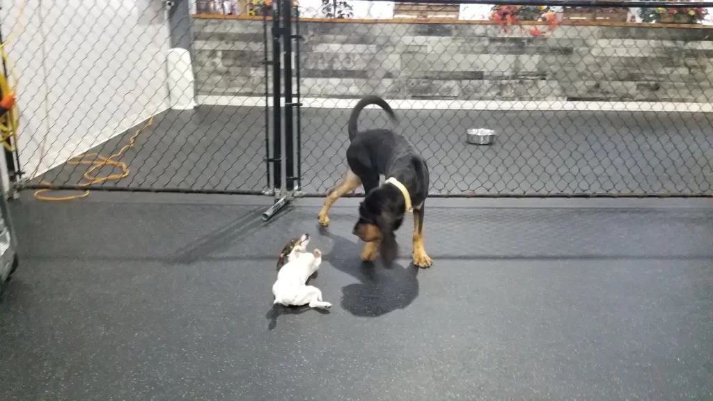 Both dogs made new friends in their separate play groups, but when they saw each other across the yard, their reactions were unmistakable.