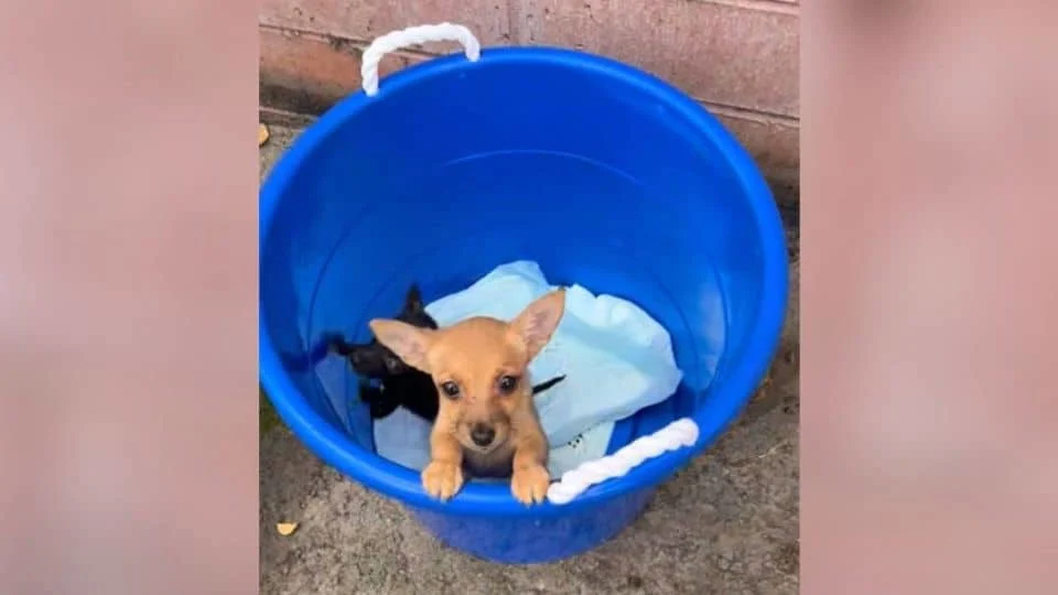 Inside the bucket were two puppies — so small they could barely keep their heads up. Their bellies rose and fell quickly, and their soft whimpers echoed in the still air.